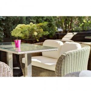 Дополнительно к ротанговому столику можно приобрести плетёную мебель из этой же коллекции, которая в полном комплекте составит лаунж зону «Римини», включающую также 2 кресла и двухместный диван с подушками со съёмными чехлами.