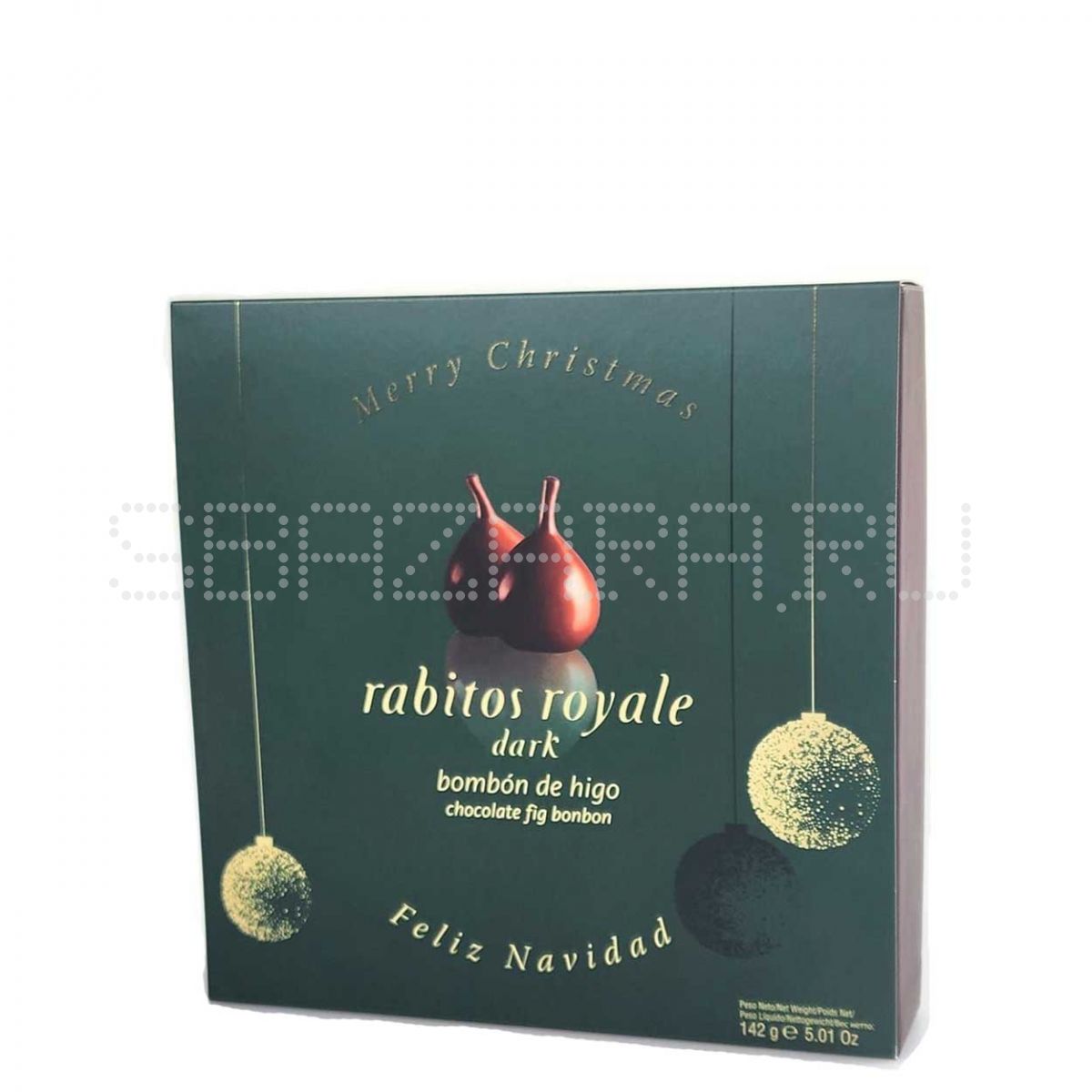 Инжир в тёмном шоколаде с трюфельной начинкой в Новогоднем шубере Rabitos Royale Dark Bombon de Higo - 8 шоколадных конфет в индивидуальной упаковке, уложенных в элегантную коробку от испанского производителя.