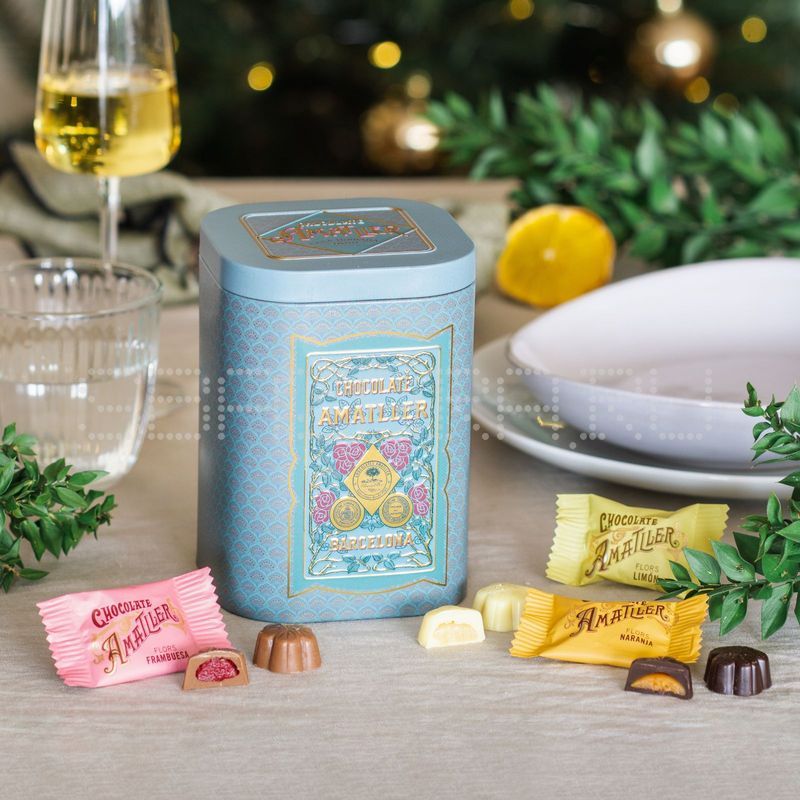 Ассорти шоколадных конфет с фруктовой начинкой: малиновой, лимонной, апельсиновой Amatller FLORS SURTIDO FRUTAS в жестяной банке от Аматллер (Барселона, Испания).