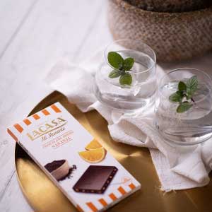 Шоколадная плитка Тёмного шоколада с засахаренной апельсиновой цедрой Lacasa Tableta Chocolate Negro con Naranja - восхитительный шоколад без глютена, от испанского производителя Лакаса (Толоса, Испания).