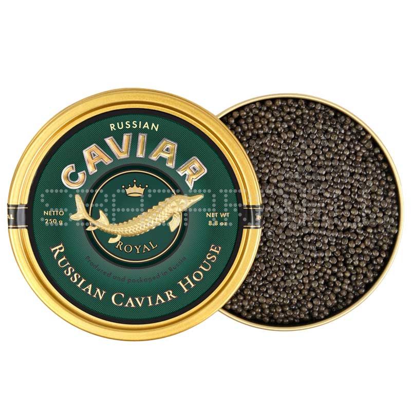 Осетровая чёрная икра Роял Русский Икорный Дом - натуральная зернистая чёрная икра осетра, полученная в результате выведение гибрида от русского и сибирского осетра, в жестяной банке 250 г, которая может стать прекрасным подарком к любому празднику (Вологодская область, Россия).