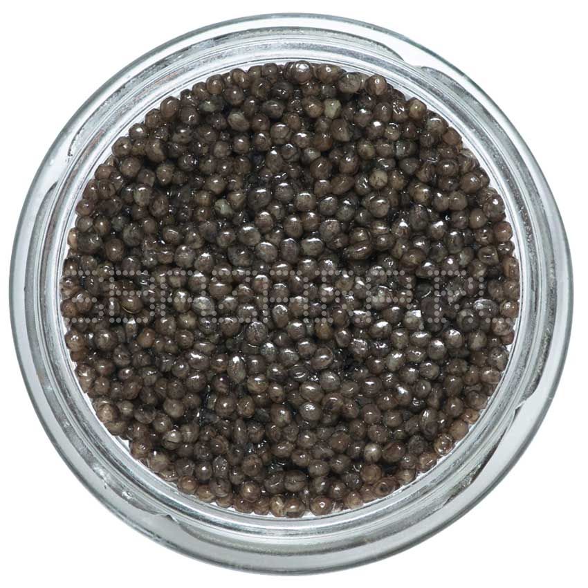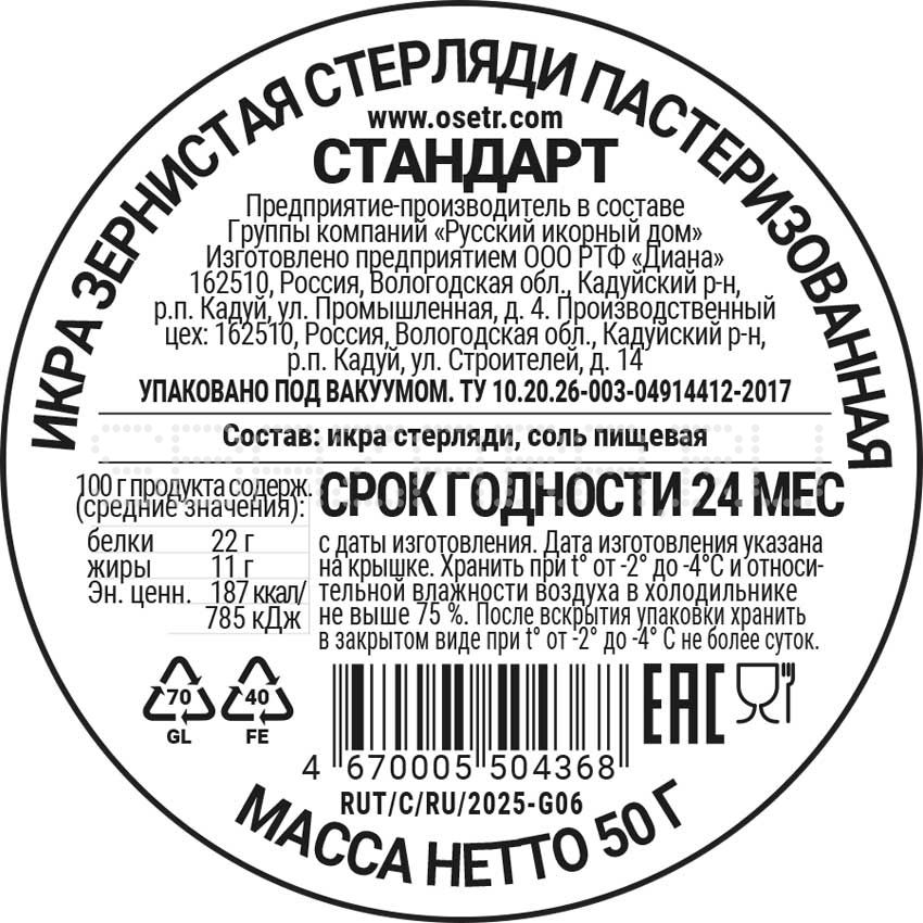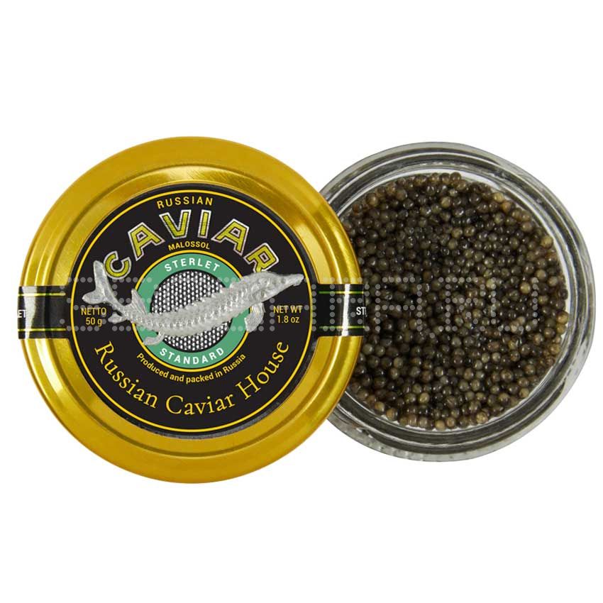 Чёрная пастеризованная икра Стерляди Russian Caviar House - икра стерляди сорта «Стандарт», изготовленная по ГОСТ 6052-2004 из зернистой черной икры высшего сорта, в стеклянной банке-твист.